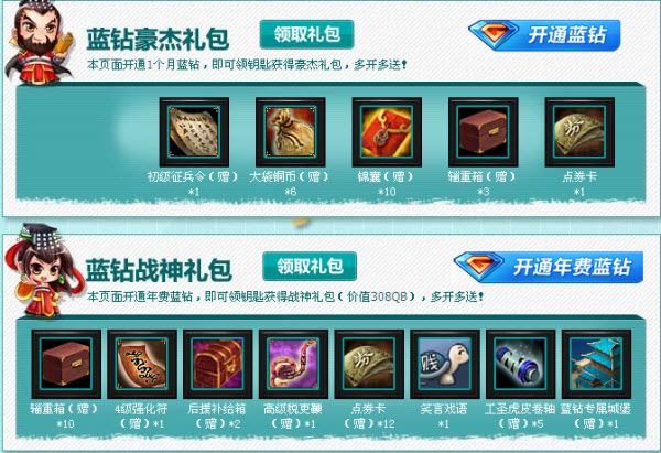 2 、活动期间在本页面一次性开通、续费年费蓝钻,即可获得战神钥匙1把,使用钥匙可领取一个战神礼包;