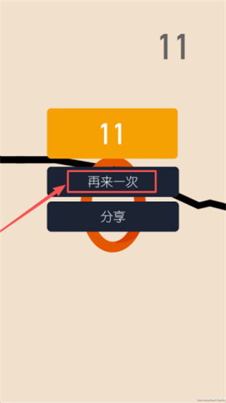 4、圆环如果过没有跳过,将会面临游戏失败的可能性,最终的分数显示是11,点击再来一次的按钮,立即重新开局。
