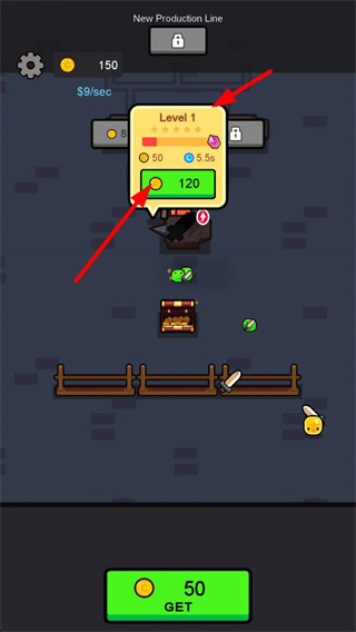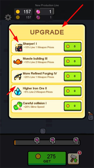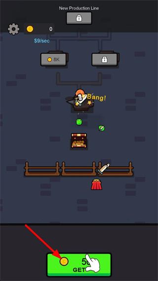 1、史莱姆会自动的制造武器,只需要点击GET来获得收益;