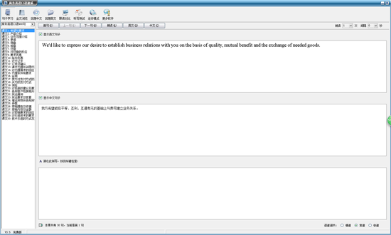 商务英语口语900句速成提供了句子学习、全文浏览、英汉互译、听写测试、迷你模式、跟读对比等功能,是商务人士必备的英语口语速成软件。