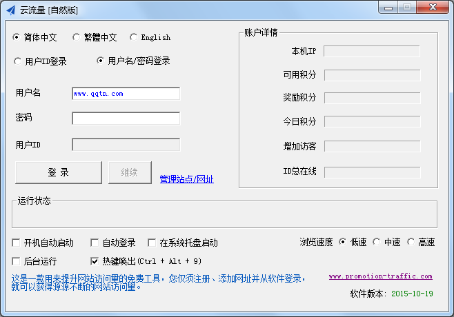 云流量客户端提供了自然版和互访版两个版本,功能主要是专门为网站运营提升访问量,还可以刷博客、QQ空间的IP、UV、PV、点击率等,用户只需要注册并登陆,添加网址,即可实现快速的增加网站的访问流量。客户端使用非IE核心的开源浏览器制作,无病毒木马,无弹窗;内存和CPU占用低,支持多进程、多线程,可有效避免运行死锁。