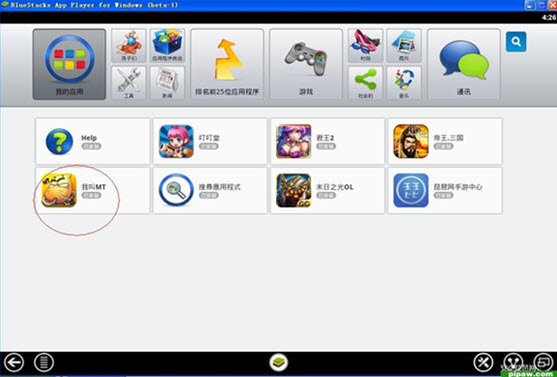第四步:成功后,打开安卓模拟器BlueStacks,如下图中所示,点图标,就可以电脑上运行《我叫mt online》啦!