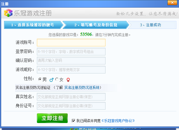 填写游戏帐号信息,填写完成,点击立即注册。