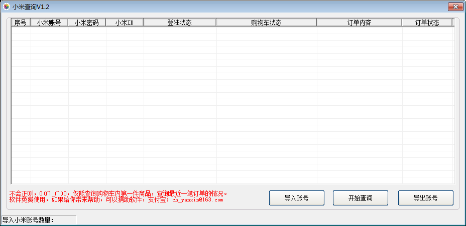 小米查询是一款用来查询和管理小米订单的一款辅助工具,工具第一个版本叫做小米购物车,专门用来查询小米帐号购物车订单详情的,现在升级为1.2版本,功能更加丰富和完善。适合那些有多个小米帐号抢购小米手机的用户使用,方便管理帐号订单及相关内容。