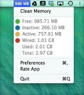 运行内存清理,单击菜单栏中的图标。一个窗口会显示你的MAC的电流活动,有线,无功动态数据,并可用内存。单击“清除内存键开始扫描释放更多的内存。扫描需要15秒和30秒之间运行,在我的经验。或者,您可以右键单击菜单栏图标,可以通过一个小的下拉菜单相同的属性和干净的存储器命令,随着应用程序的偏好。