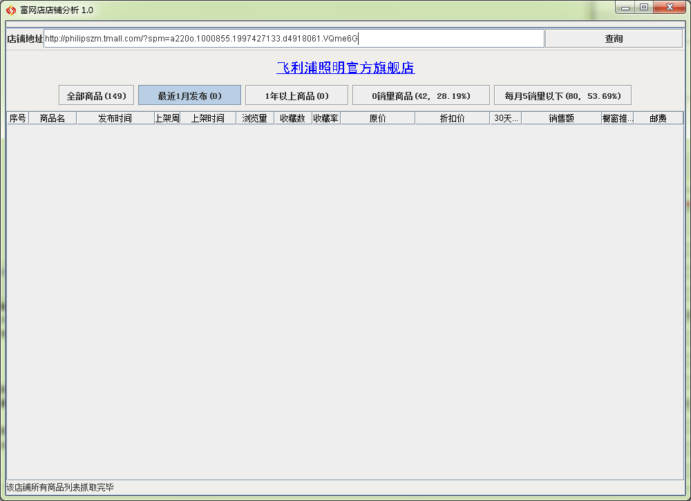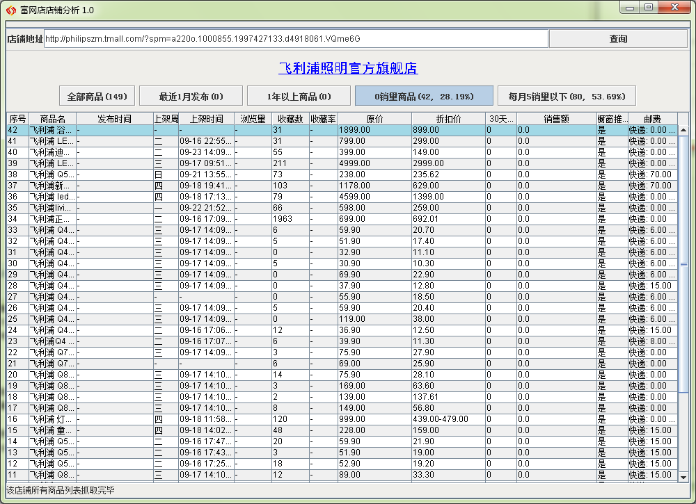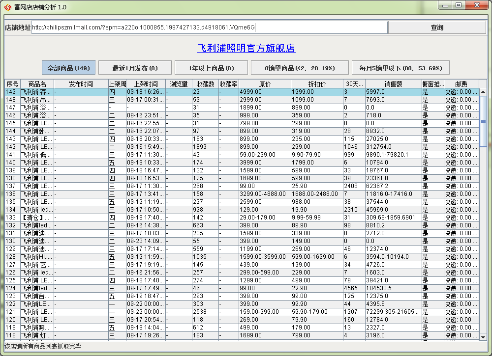 富网店淘宝店铺分析软件是一款最专业的淘宝天猫店铺分析软件,能够将店铺所有宝贝的名称、发布时间、上架周、上架时间、浏览量、收藏数、收藏率、原价、折扣价、30天销量、销售额、是否橱窗推荐、邮费等详细的商品信息。支持淘宝天猫所有店铺使用,可以用来查询自己店铺或是其它竞争对手店铺,进行合理化分析。