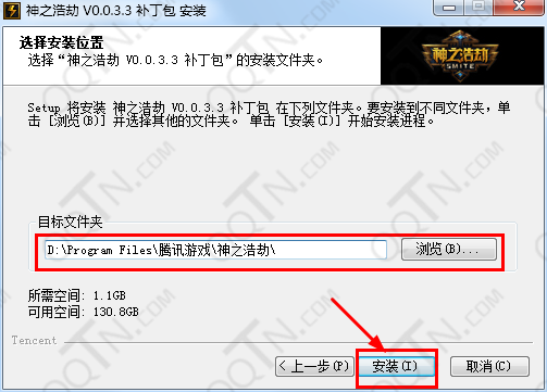4.将补丁安装到神之浩劫游戏的安装目录内,如:“D:\Program Files\腾讯游戏\神之浩劫”,点击“安装”