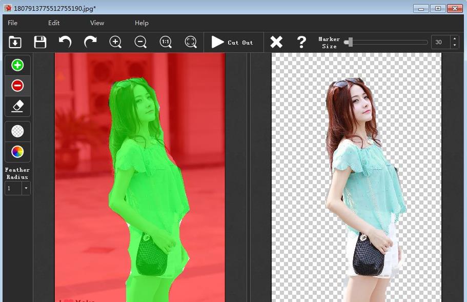 第三步:直接点击中间的Cut Out按钮抠图就行了。就是这么简单。。抠图后的结果直接在右侧窗口中显示出来了!