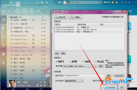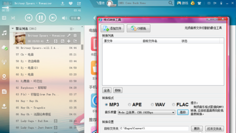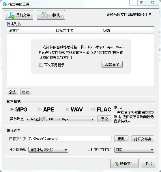 酷狗格式转换小工具支持MP3、APE、WAV、FLAC四种音频格式,支持多种音乐质量选择,可以批量转换音乐格式,同时还拥有无损音质文件切割功能。