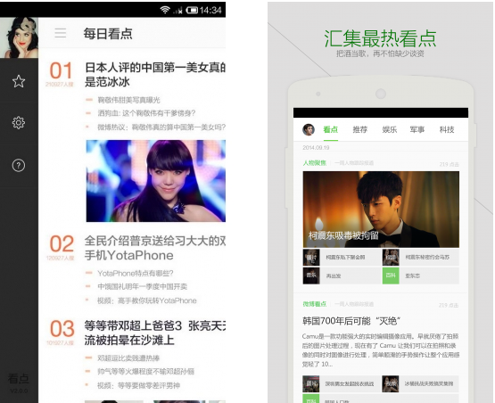看点是新闻团队打造的一款内容类APP,每天精心挑选极具传播性的各类看点,按照早、中、晚、夜四档提供给用户,同时兼顾传统用户分栏目浏览的习惯,在主界面底部提供了推荐更多的入口,包括新闻和特色内容;