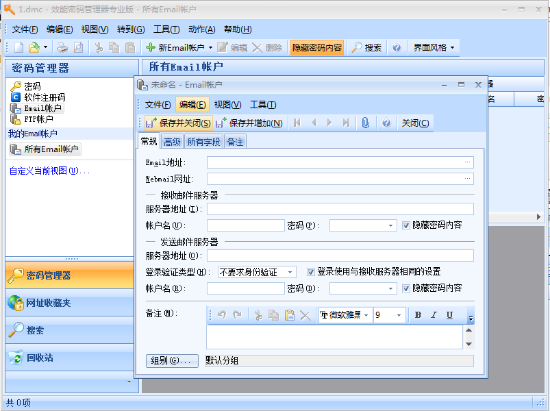 还可以记录网站登录密码、软件注册码、Email帐户密码。