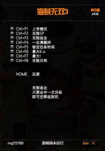 海贼无双3 v1.0中文属性修改器;由3DM论坛版主 mq2151189 制作分享分享,关于版本支持 理论支持未来更新版本 如果游戏代码变动不大的话(当然也支持汉化版);需要的玩家自行下载。