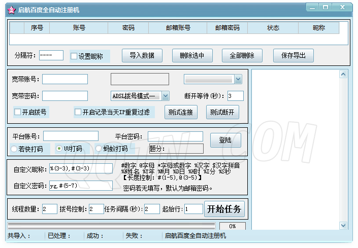 启航百度注册激活公开版是一款强大的百度账号注册机。界面清爽,操作简单。支持多种打码方式,支持自定义昵称,支持批量导入。是一款比较优秀的百度账号注册机。