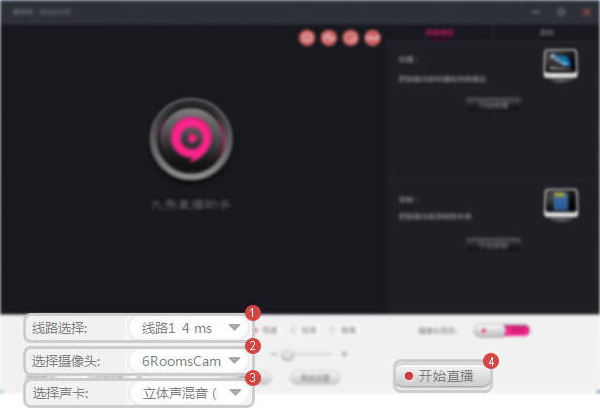 3.在软件窗口正确设置:①线路选择②摄像头③声卡;点击④”开始直播“按钮进入直播间开始直播。