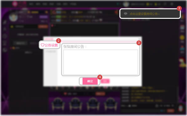 主播进入自己的房间内①点击公告设置 ②在弹出窗口中点击“公告设置” ③在空白区域内编辑公告内容 ④点击“确定”即可。