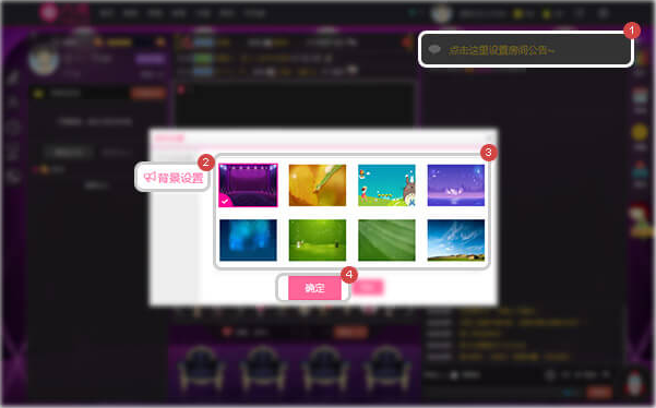 主播进入自己的房间内①点击公告设置 ②在弹出窗口中点击“背景设置” ③选择背景 ④点击“确定”即可。