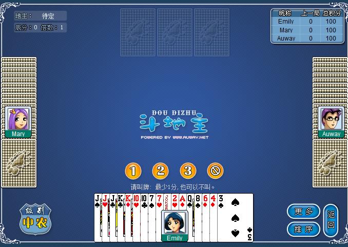 叫牌:按出牌顺序叫牌的底分如“X1”"X2"等,叫牌完毕后叫分最多者为地主,都不叫牌则默认第一位为地主。