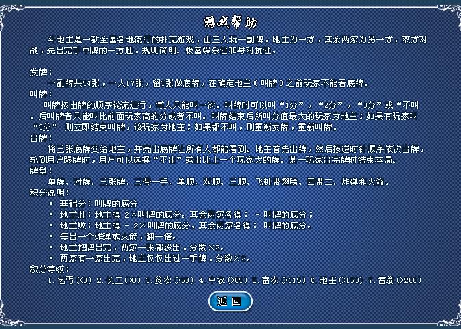 本款游戏主要由三人参加,使用一副扑克,开局选出一名地主后,另外两人结成联盟为农民,双方阵营对战,率先出完手中剩余牌组的一方获胜获得胜利赢取积分。