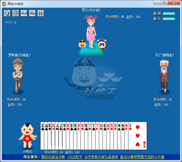 阿达斗地主是一款单机版斗地主小游戏,这款阿达斗地主玩法简单,娱乐性强,老少皆宜。据传在万恶的旧社会,地主横行乡里,无恶不做,人们为了发泄对地主的痛恨,常常在一天的劳作之后,一家人关起门来"斗地主"。该游戏由四个人玩,用两副牌,地主为一方,其余三家为另一方,双方对战,先出完牌的一方获胜。经典的单机版本斗地主,两副牌4个人玩法。