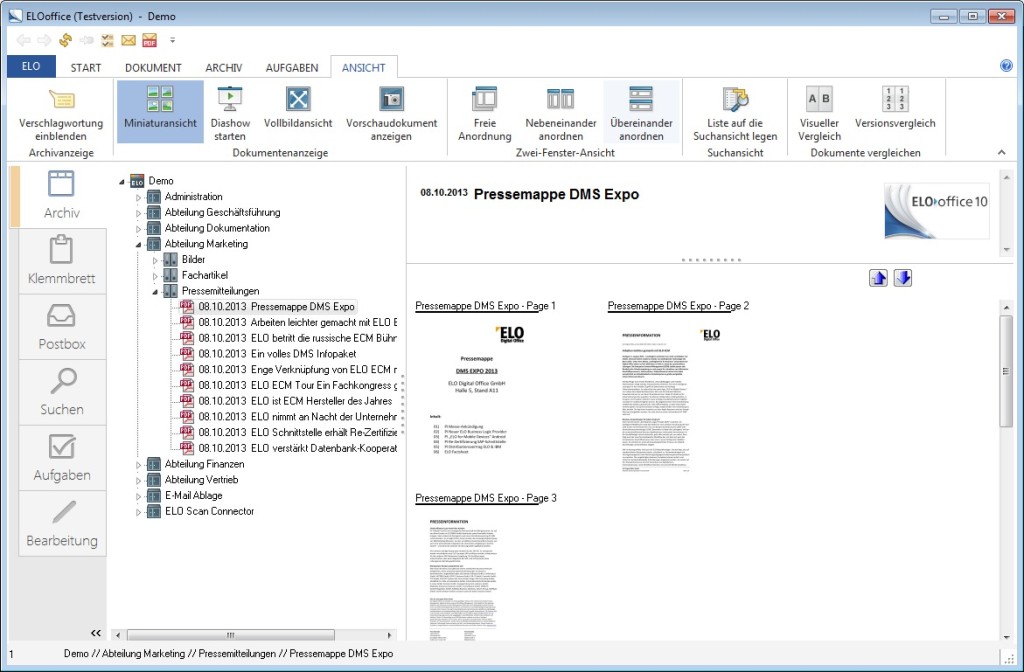 办公软件ELOoffice程序是基于模拟归档系统,包括仓库,文件和文件夹。这使得使用软件可以不费时的训练。用户可在文件结构中,打开文件夹和叶通过用鼠标文件导航。用户友好的ELOoffice软件可以帮助你加快你的流程,简化您的日常工作负担,提高工作效率,在长期的。
