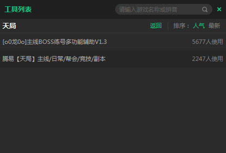 新浪天局辅助,提供了两款辅助脚本,具有角色挂机、游戏多开、自动喊话、自动主线、日常副本等功能,是天局玩家必备辅助工具。