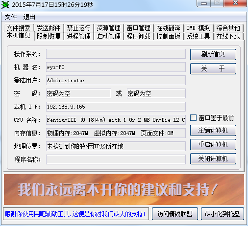 在网吧上网,电脑受到了很多限制,很多功能都实现不了,腾牛网建议使用佳佳辅助网吧解除限制工具,可以实现大多数被网管限制的功能。
